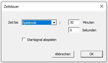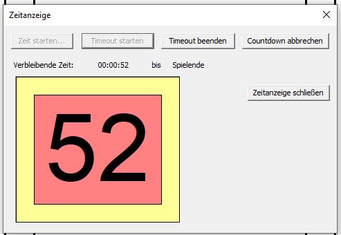 Die Zeitanzeige wird über den Menübefehl 'Spezial->Zeitanzeige öffnen' geöffnet. Sie dient dazu, die noch verbleibende Zeit bis zu einem bestimmten Zeitpunkt (z.B. Spielende, Halbzeit) in Form eines Countdowns anzuzeigen. Außerdem wird bei Zeitablauf ein akustisches Signal ausgegeben.