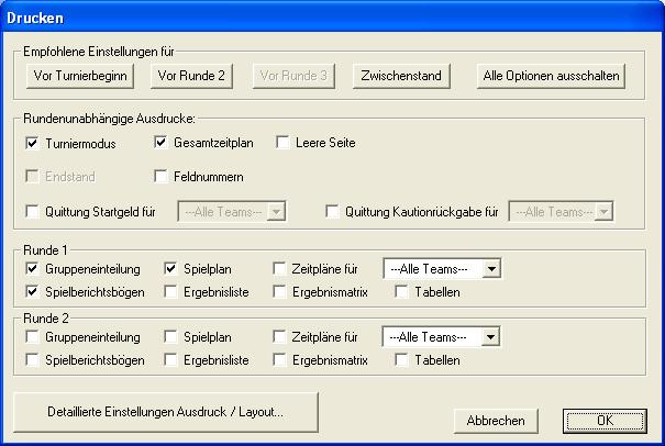 Aktiviert die Optionen für alles, was üblicherweise vor Turnierbeginn ausgedruckt wird, also z.B. den Spielplan und die Spielberichtsbögen der 1. Runde.