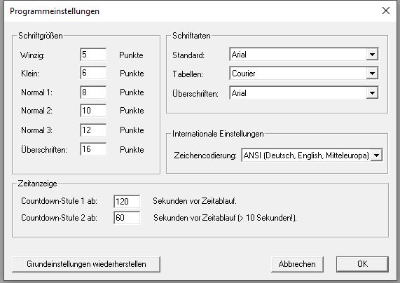 Schriftarten und Schriftgrößen, die vom Programm für die Ausdrucke und Bildschirmausgaben verwendet werden.