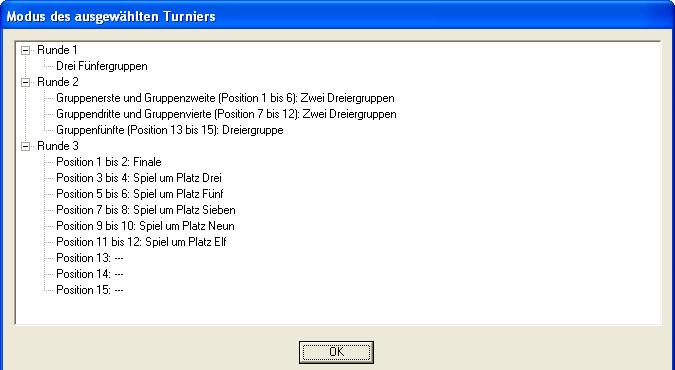 In der dritten Runde [(3)(3)(3)(2)(2)(2)] spielt eine Dreiergruppe (also die Sieger der ersten drei Gruppen der zweiten Runde) um Platz eins bis drei.