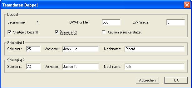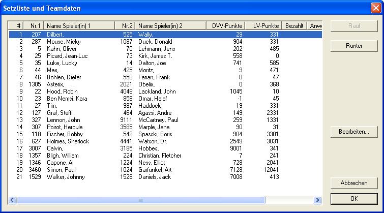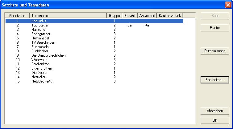 In diesem Dialog kann die Setzlistenreihenfolge der Teams verändert werden. Diese Reihenfolge beeinflußt bei Gruppenturnieren die Gruppeneinteilung. Außerdem können neben dem Teamnamen noch weitere Daten der Teams erfaßt werden.