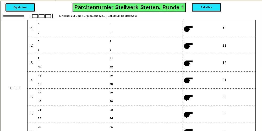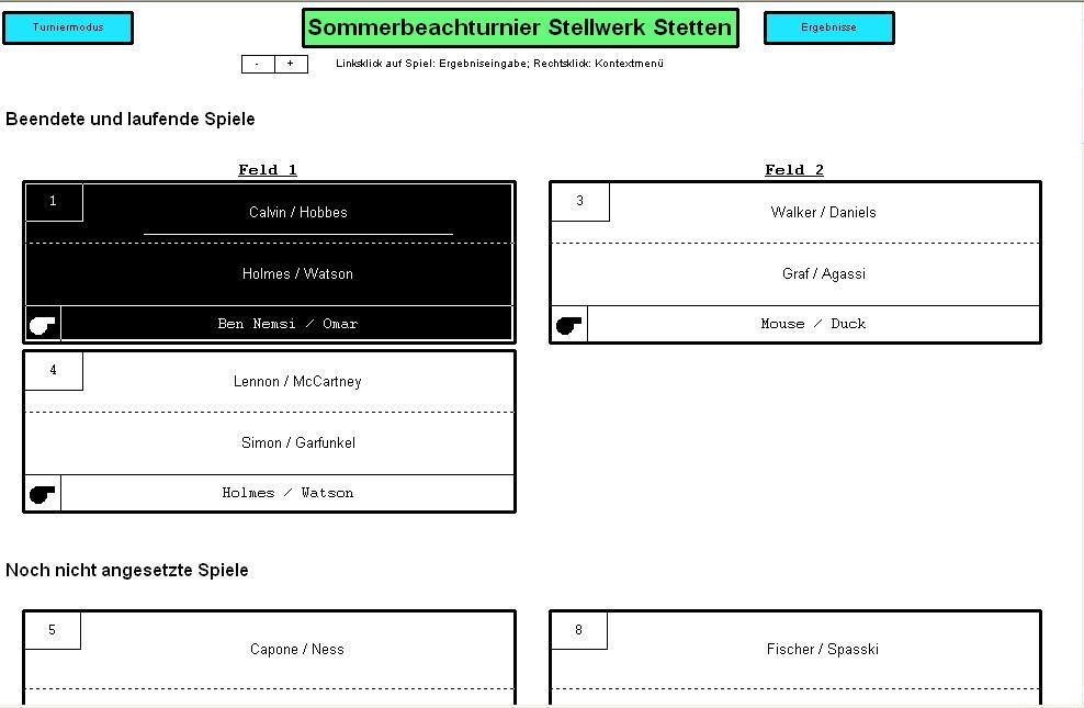 Da vor Turnierbeginn nicht bekannt ist, wie lange die einzelnen Spiele dauern, werden nur die allersten Spiele auf jedem Feld automatisch vom Programm angesetzt.